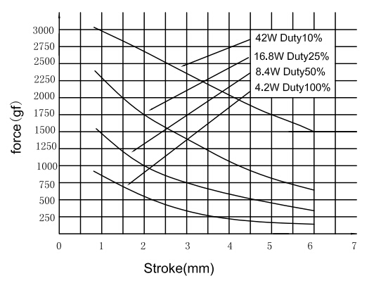圖解:1,上圖描述的是推拉式電磁鐵的行程和力量曲線圖
